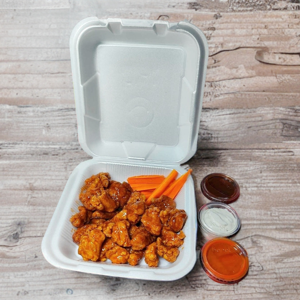 Boneless en salsa de tu preferencia sobre una cama de papas con queso, tocino y ranch.