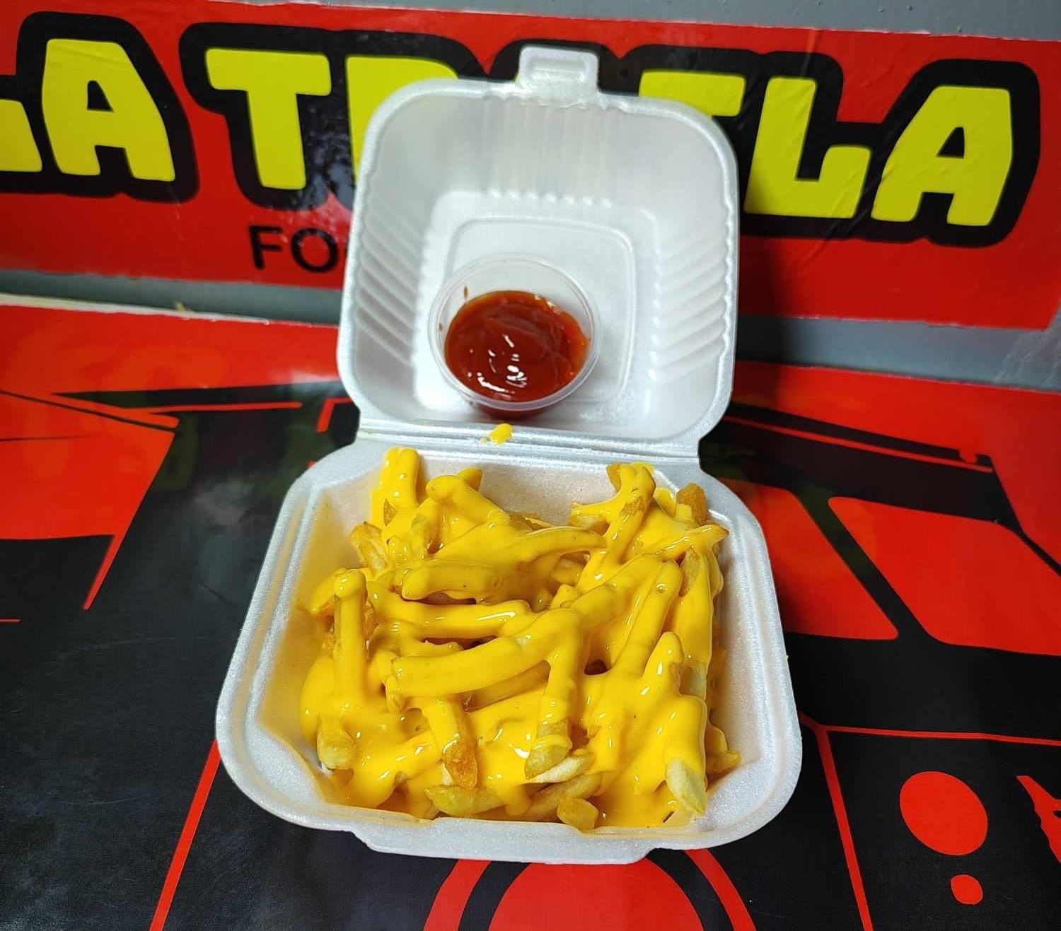 Trocitos de salchicha con papas a la francesa bañadas en queso.