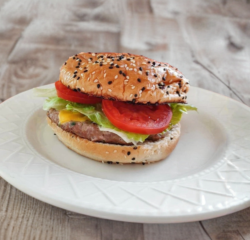 1/4 De libra de carne casera de res y de cerdo 70/30, con queso, mayonesa, cátsup, mostaza lechuga y tomate.