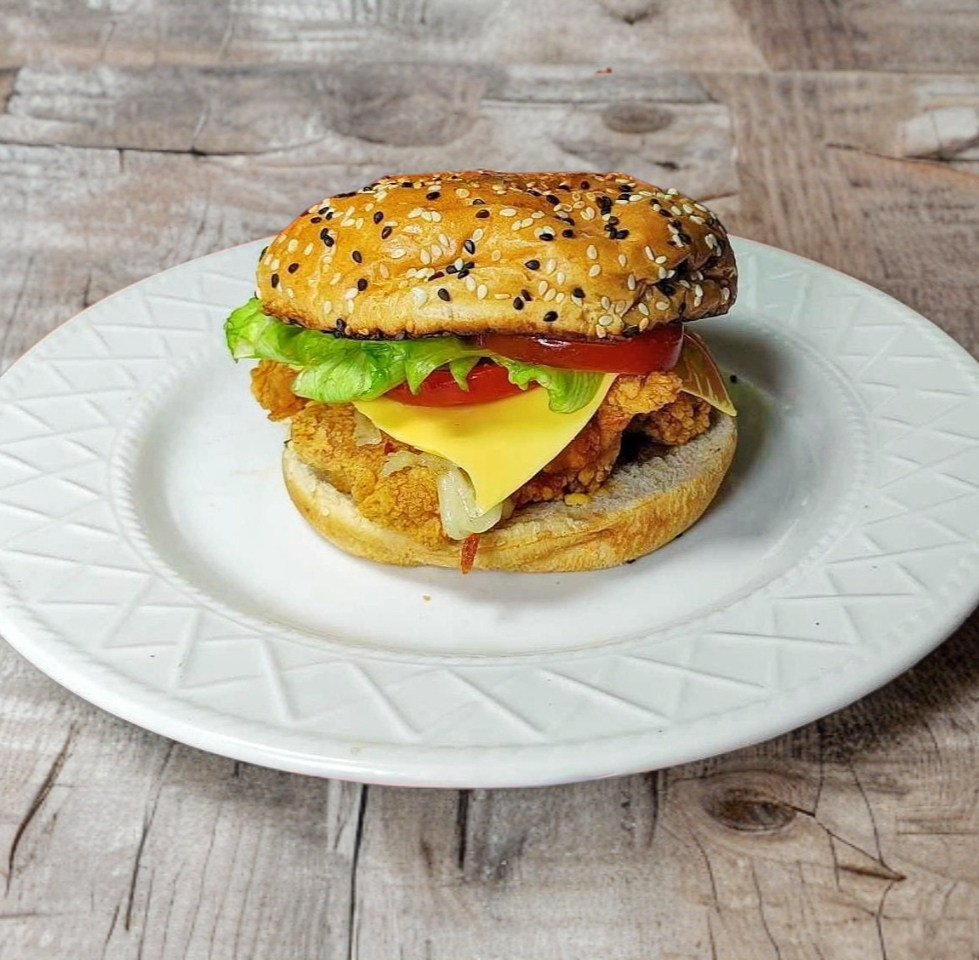 Doble porción 1/4 de libra de pollo empanizado c/Queso, mayonesa, cátsup, mostaza, lechuga y tomate.