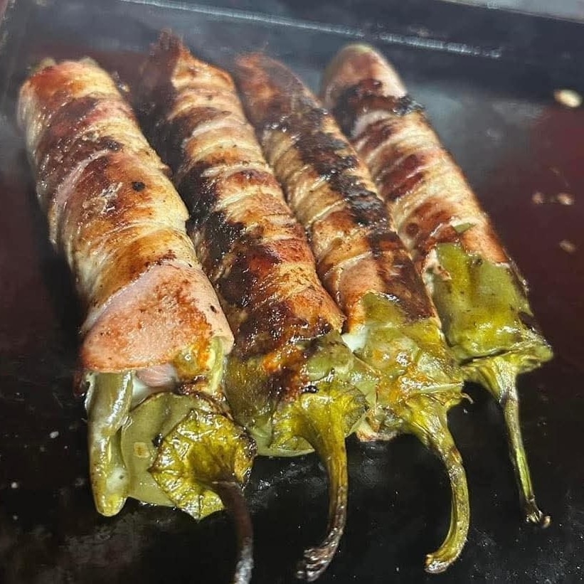 Chile relleno de queso y salchicha ¡Envuelto en tocino!