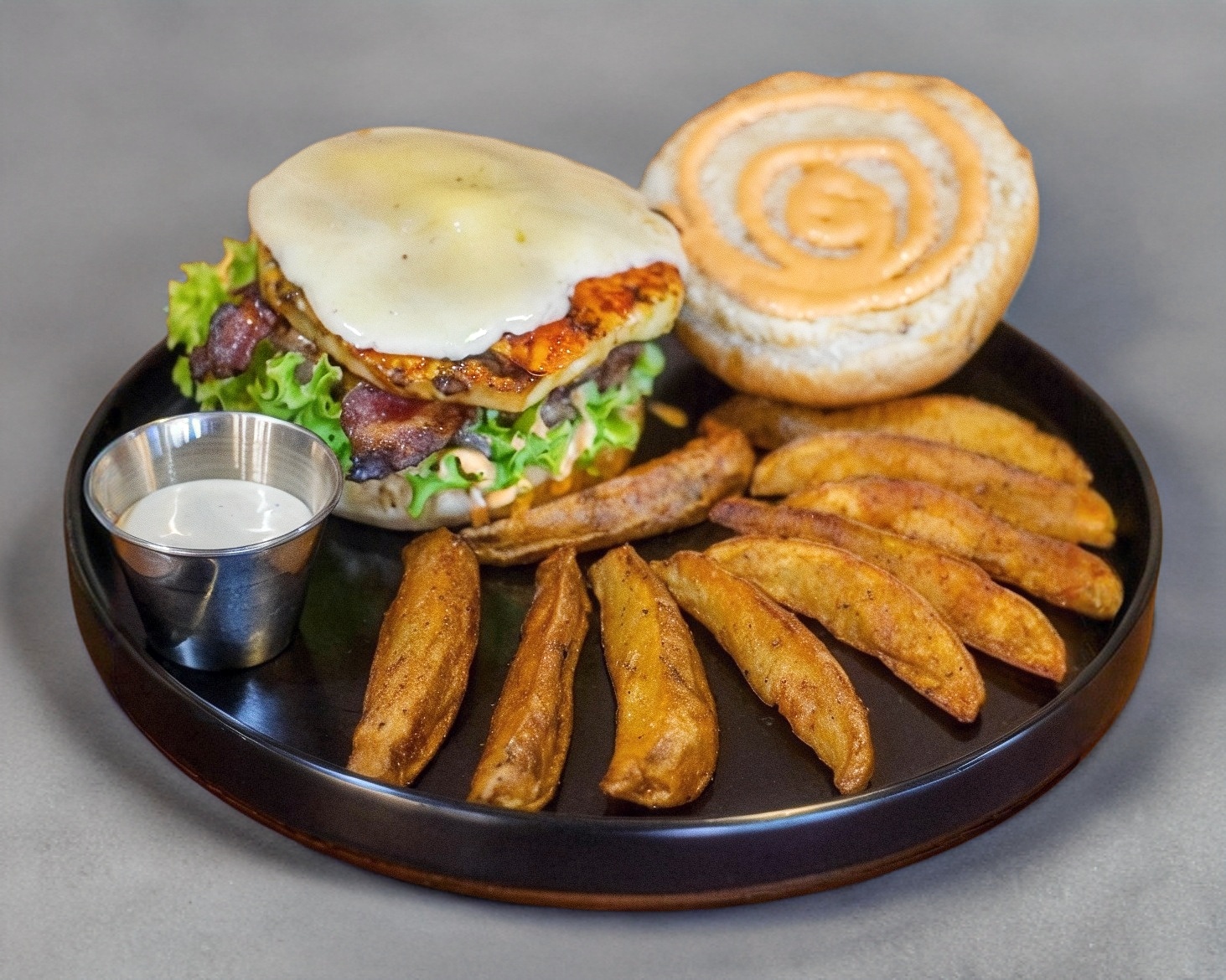 Sirloin, aderezo de Sriracha, piña al grill, tocino y queso gouda, incluye papas sazonadas
