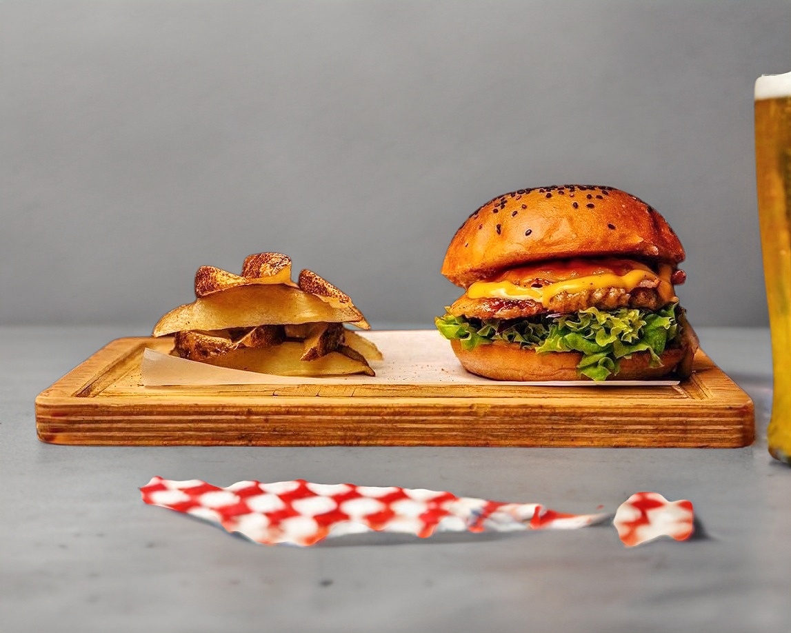 carne 50% de res y 50 % tocino, aderezo de la casa, lechuga, tomate y cebolla, queso cheddar, incluye ricas papas de gajo sazonadas, y soda