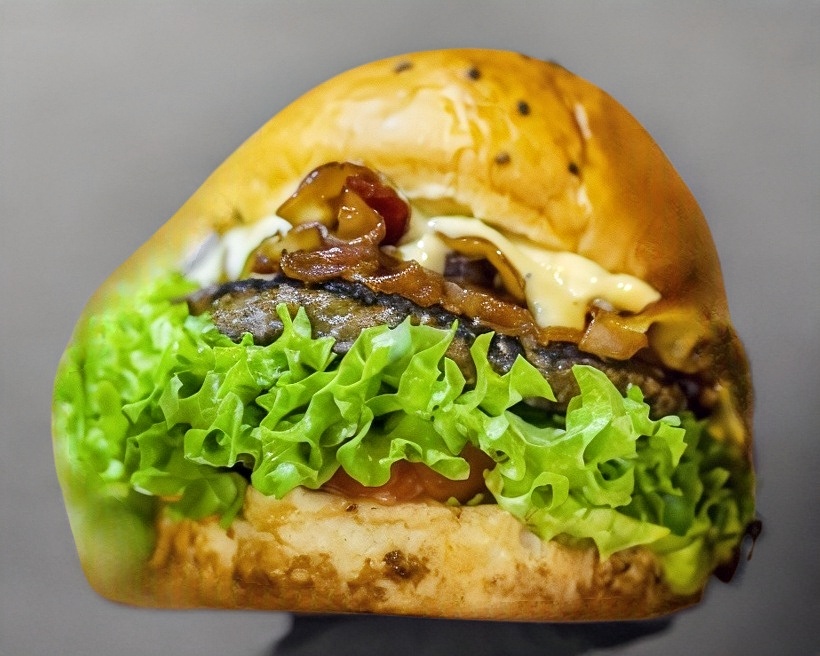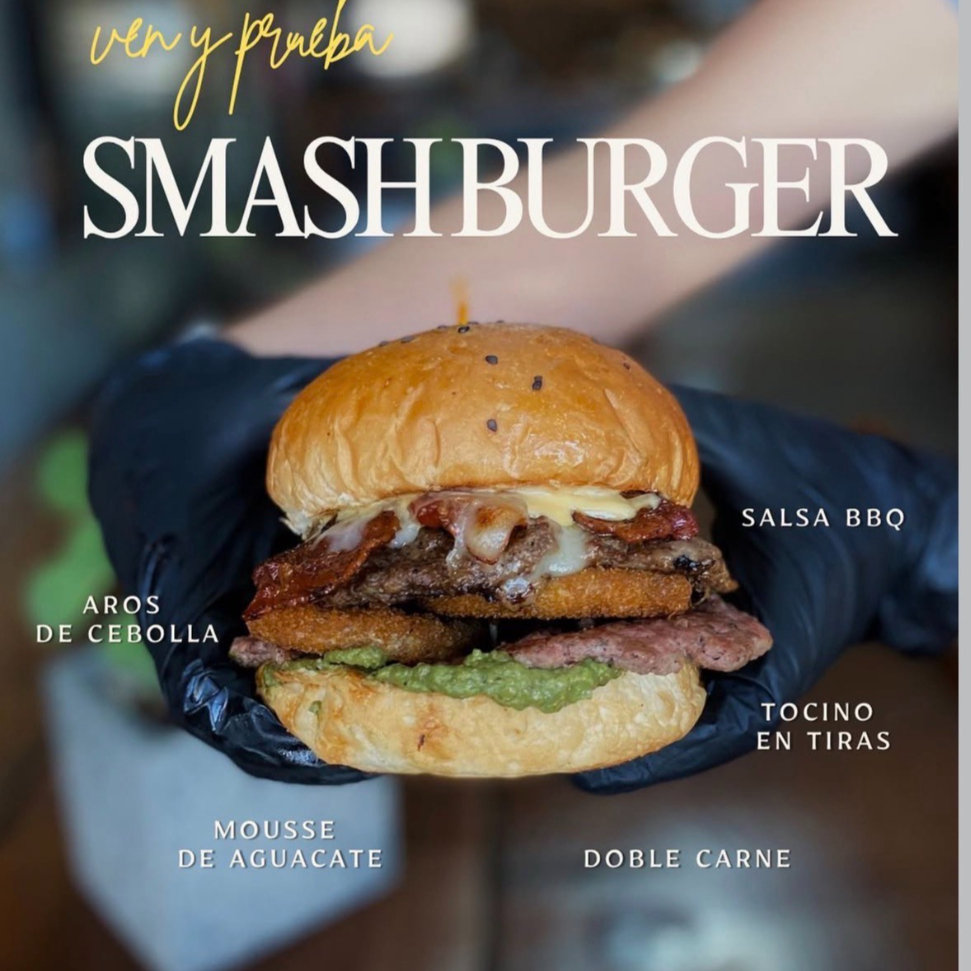 incluye doble carne smash, musse de aguacate, aros de cebolla, tocino en tiras, queso blanco, salsa BBQ