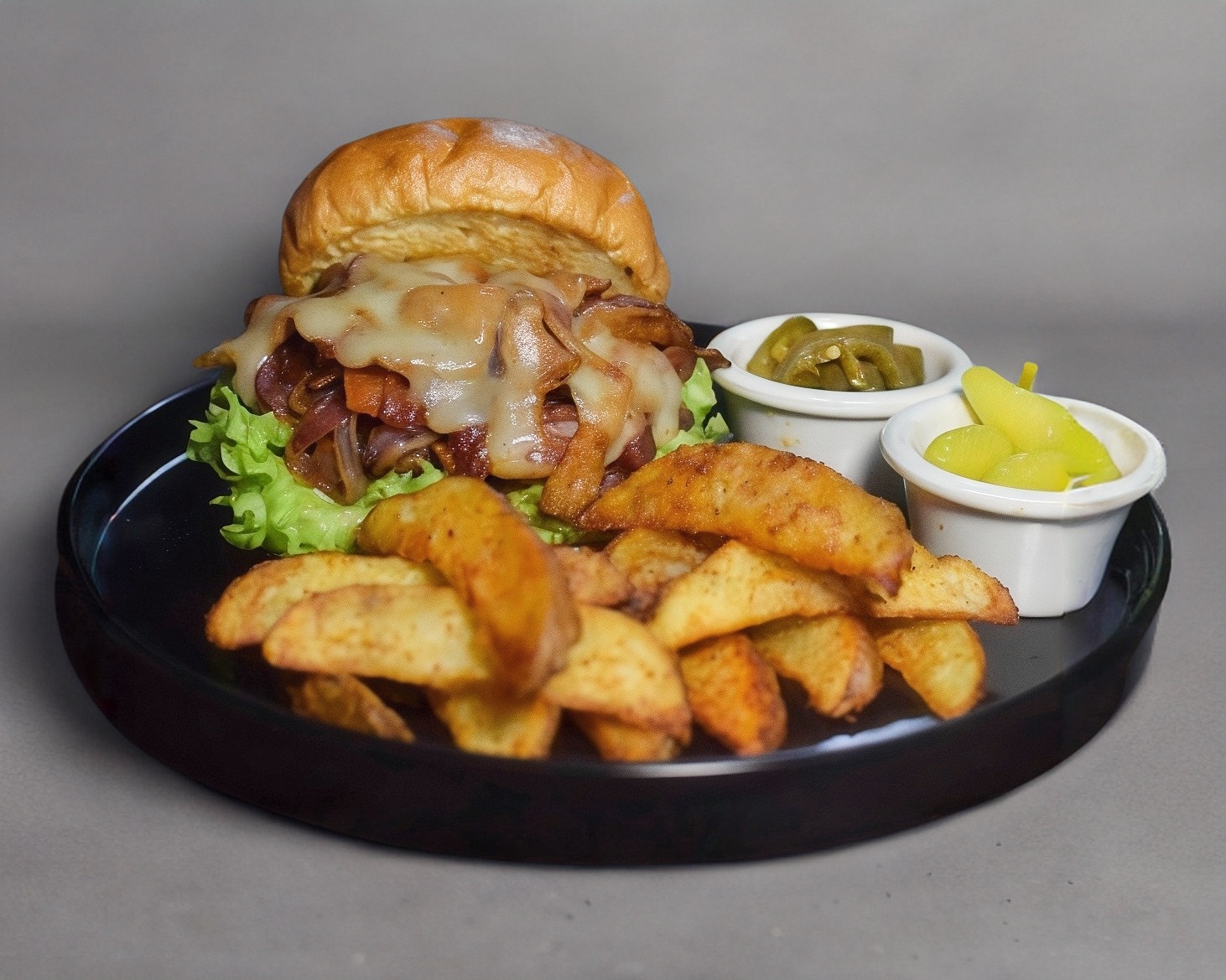 Sirloin, aderezo de la casa, harto tocino, cebolla caramelizada, aguacate y queso menonita, incluye papas sazonadas, incluye papas sazonadas