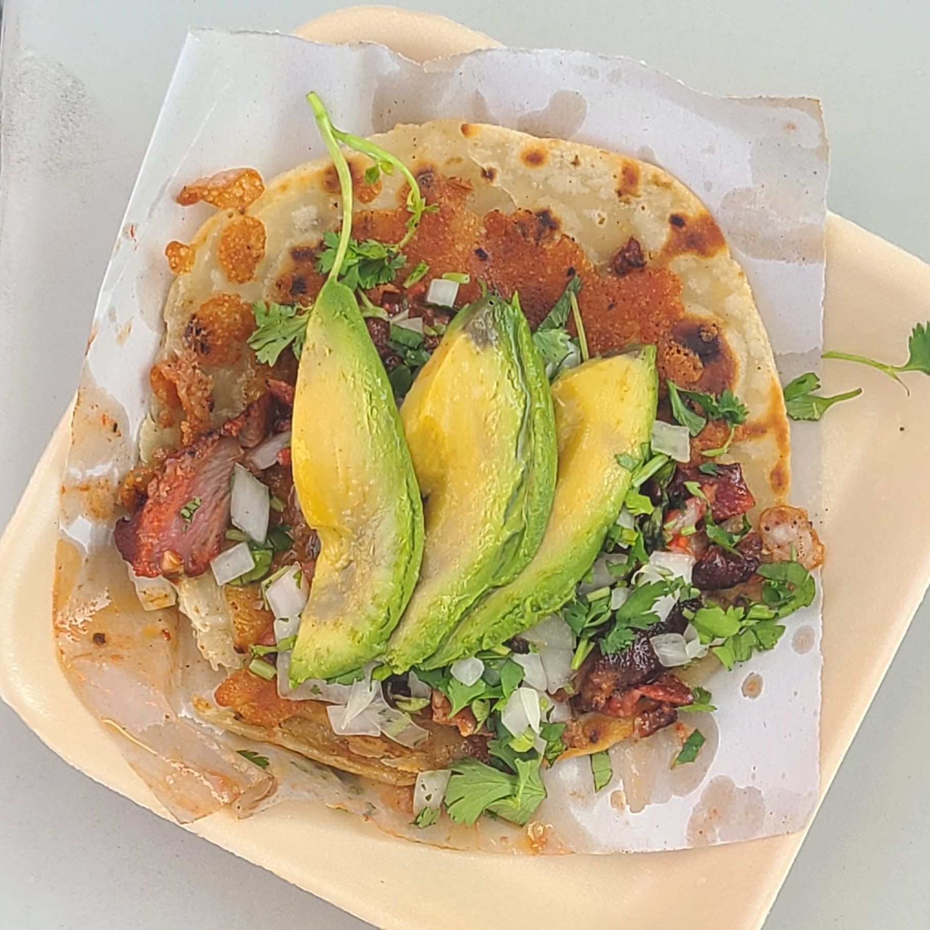Adobada, cebolla, cilantro, aguacate