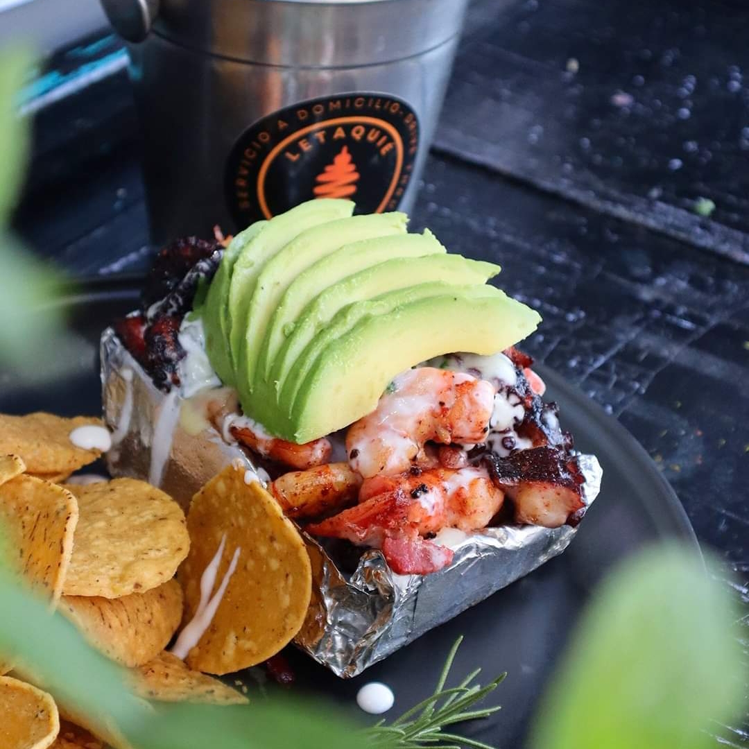 Camarón, papa, queso, crema, cebolla, cilantro, aguacate