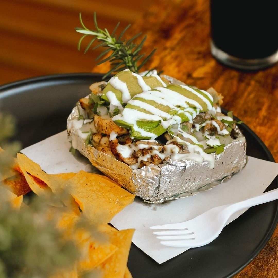 Triple, papa, queso, crema, cebolla, cilantro, aguacate