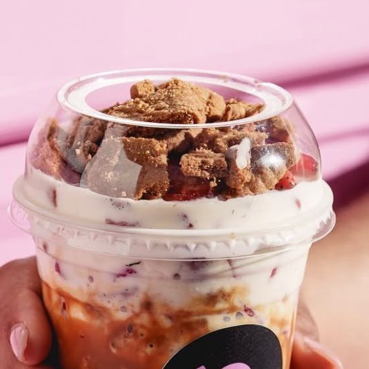 Vaso 12oz con crema biscoff, fresas con crema, galleta lotus enmedio y encima, con jarabe biscoff.