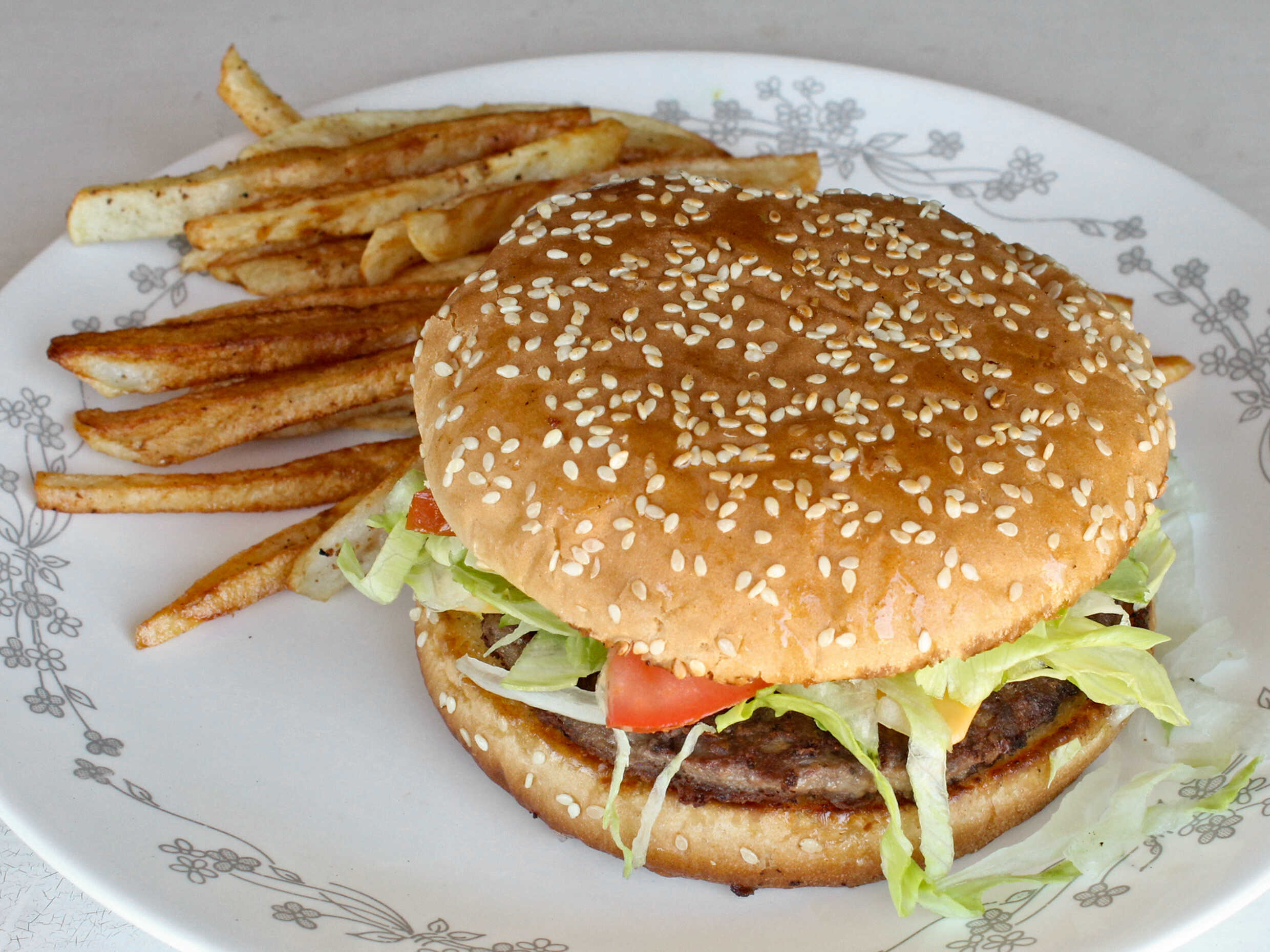 Carne, queso, lechuga, tomate, cebolla, aderezos, acompañada de papas a las francesa.