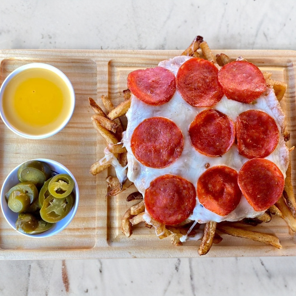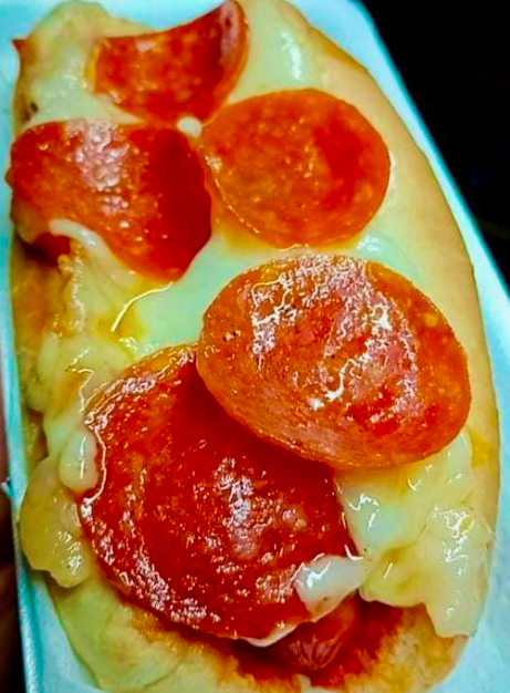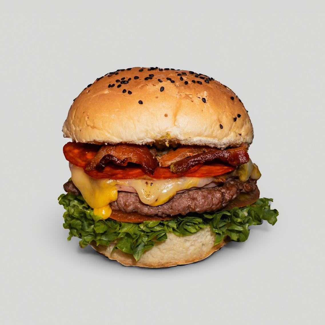 Con carne, queso, tocino y pepperoni.