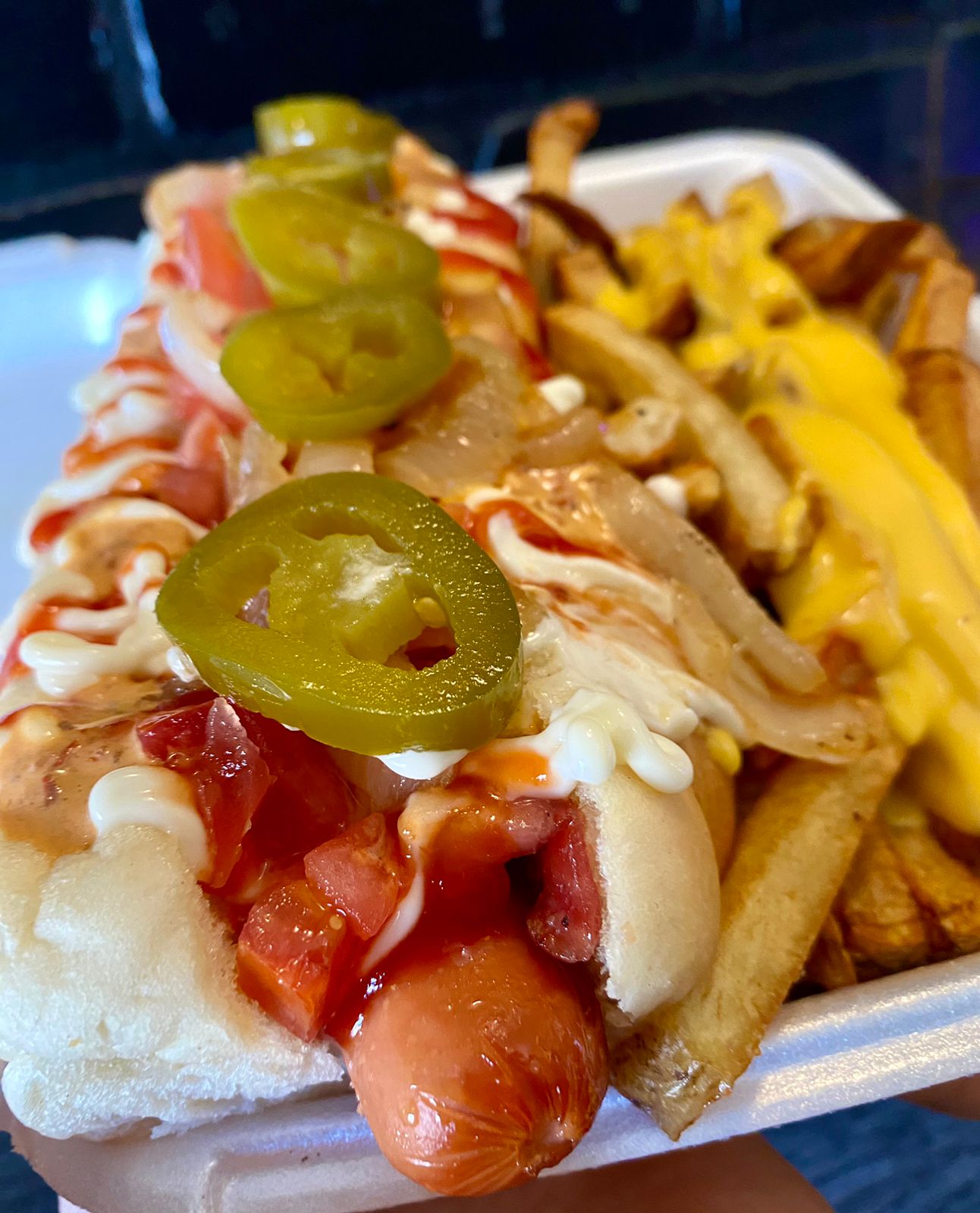 Salchicha, queso nacho y jalapeño.