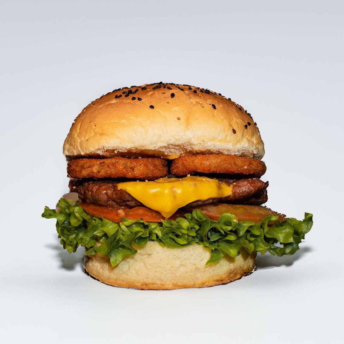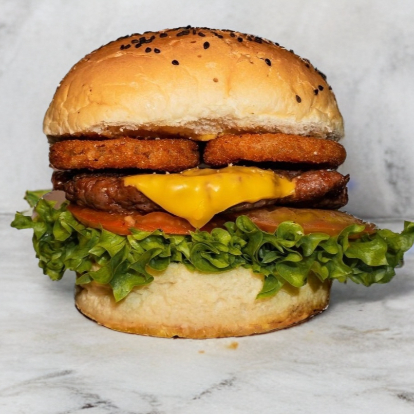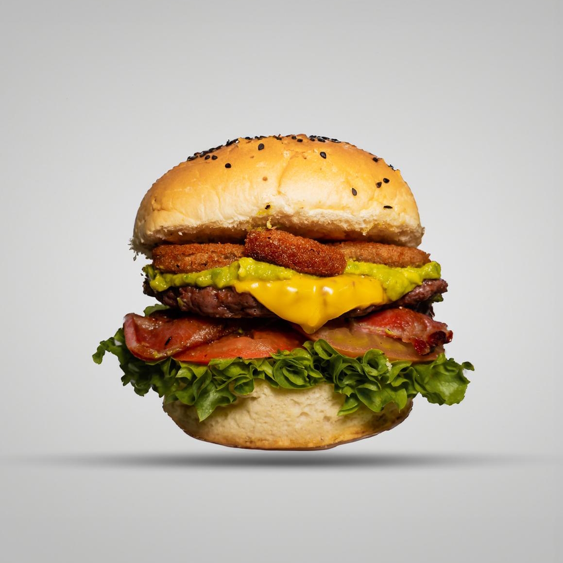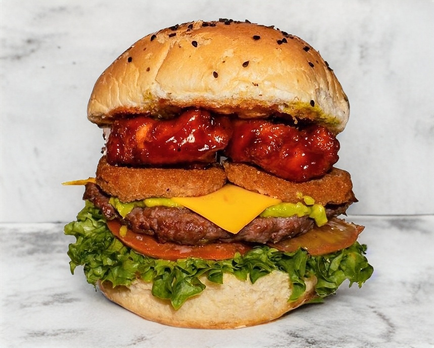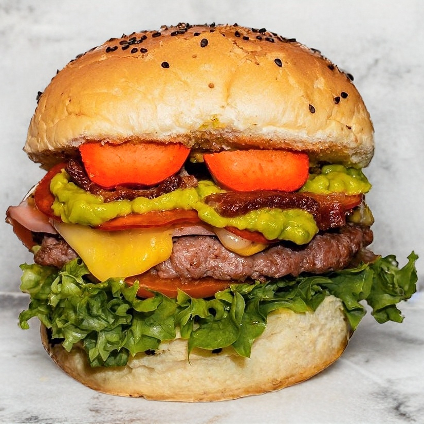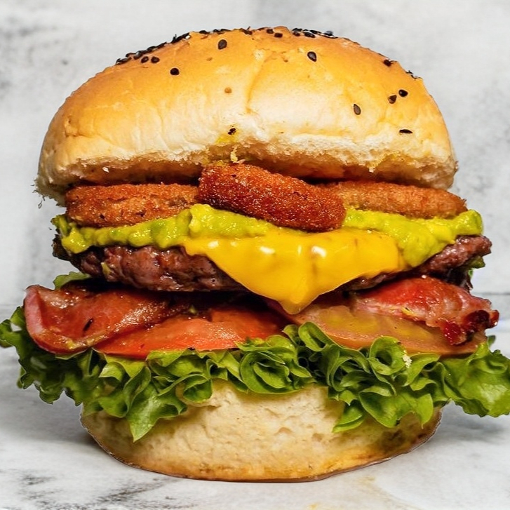 Carne, queso, aros de cebolla, tocino y aguacate.