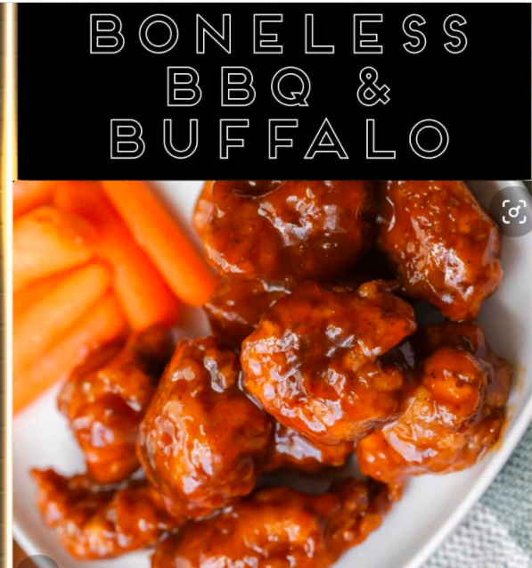 Queso nacho, boneless bbq o búfalo y ranch.