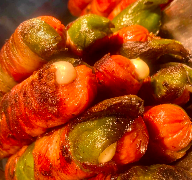 Salchicha, tocino, queso nacho y jalapeño.