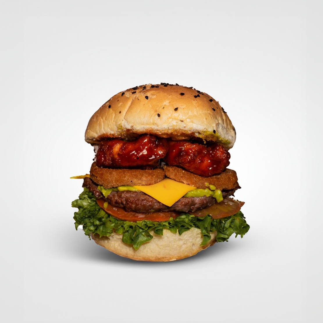 Boneless , queso amarillo , aros de cebolla , Aguacate ,tomate , lechuga