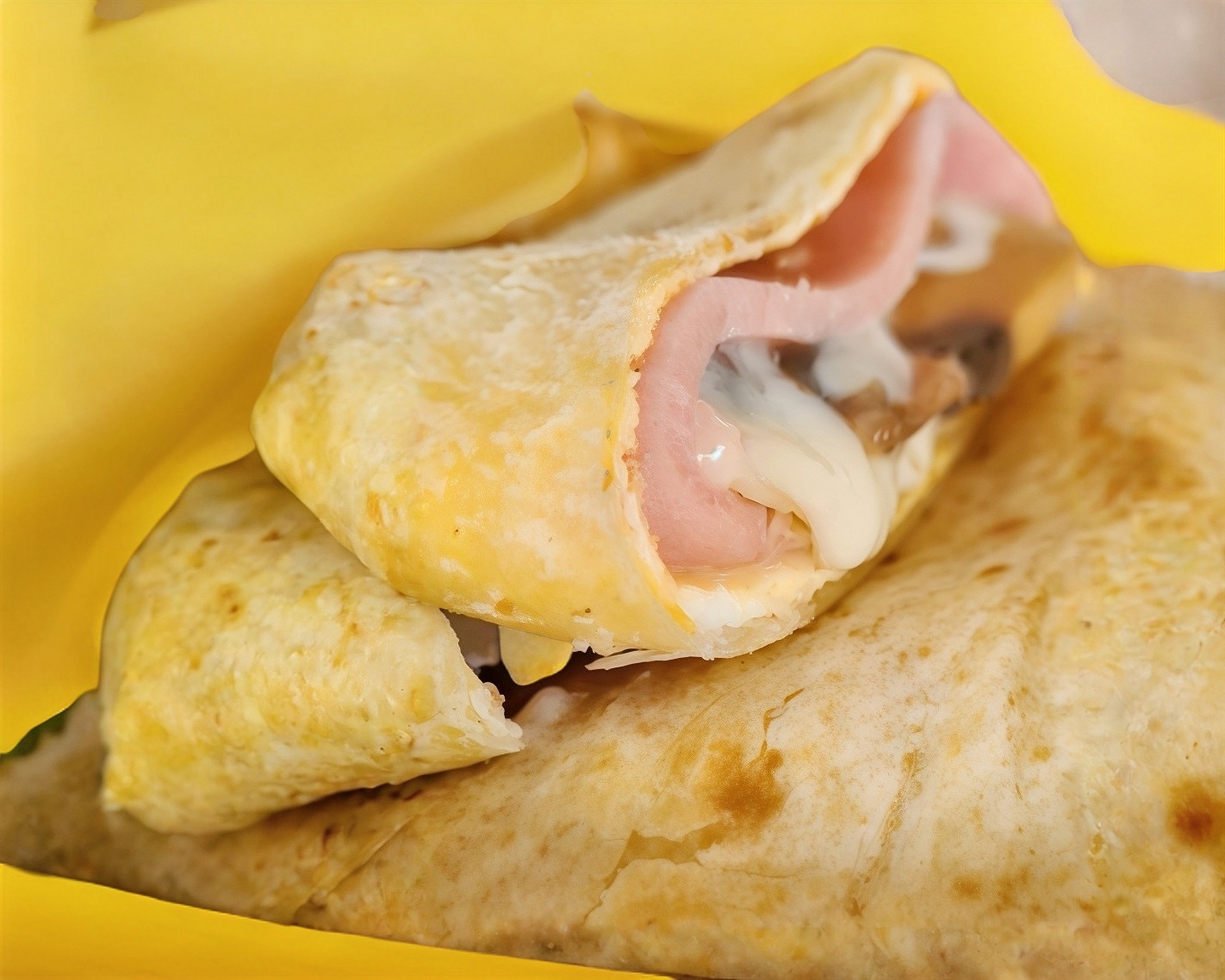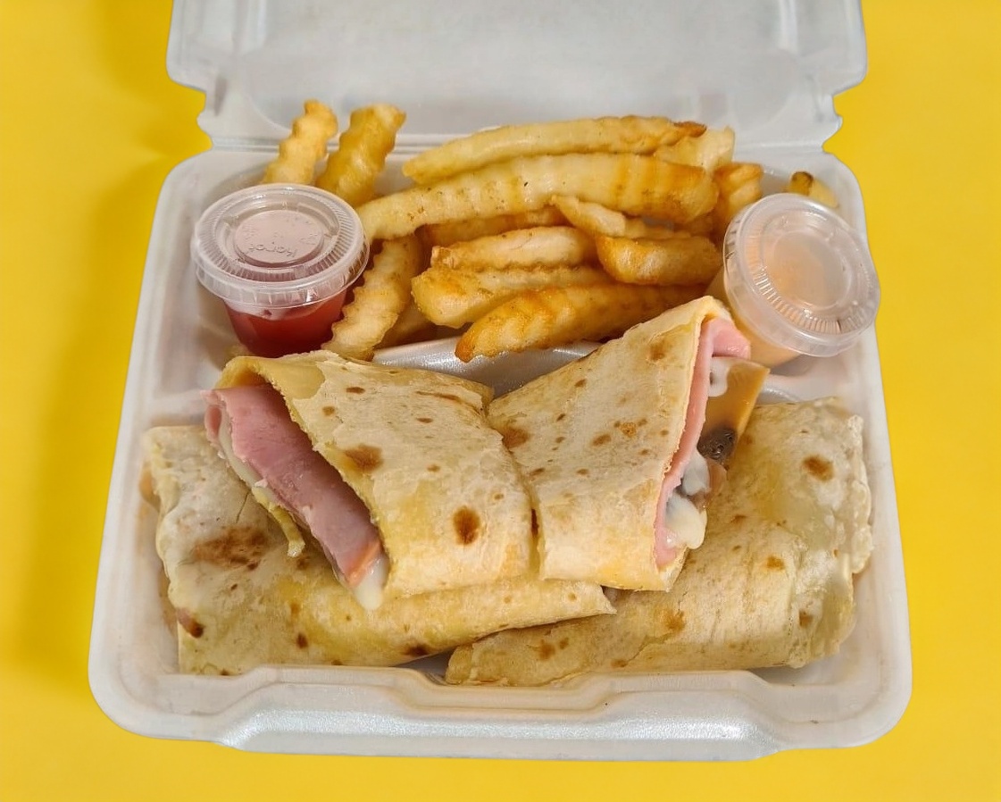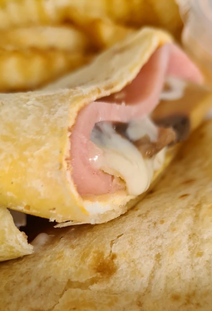 Burro con tortilla sobaquera 2 huevos, combinación de quesos y jamón ahumado, acompañado con papas fritas.
