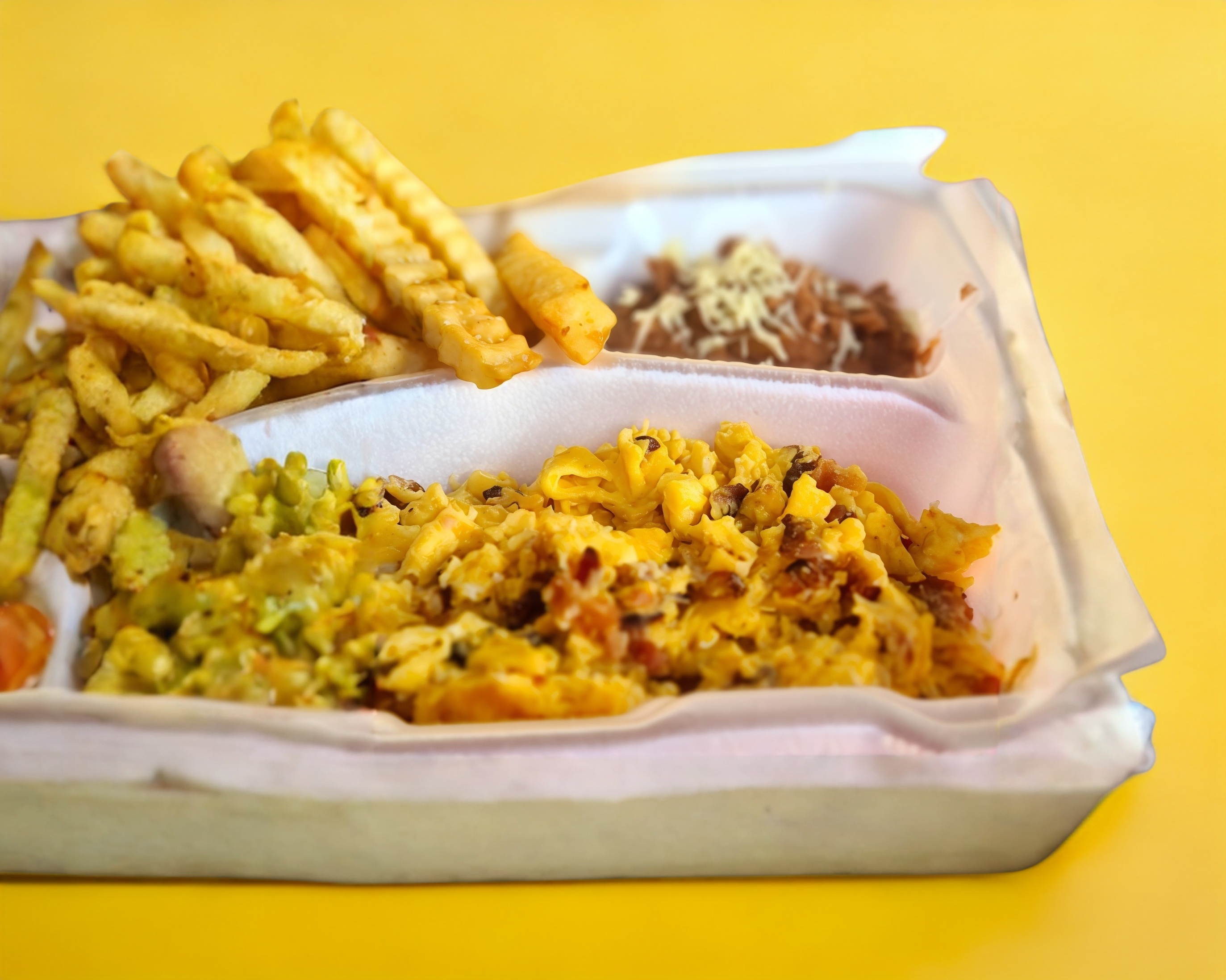 Burro con tortilla sobaquera 2 huevos, combinación de quesos y tocino, acompañado con papas fritas.
