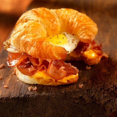 Croissant con tocino, huevo, combinacion de quesos, jamón ahumado y acompañado con papas fritas.