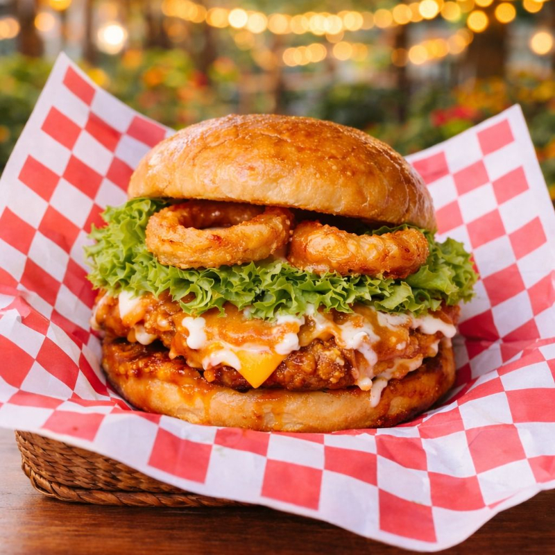 Carne de res,salchicha de res,queso amarillo,queso monterrey,tocino,aros de cebolla,tomate,lechuga italiana y aderezo BBQ