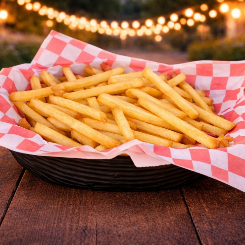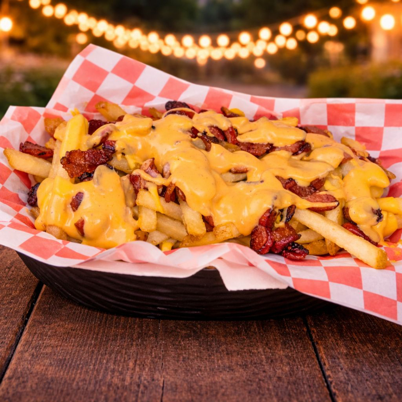Papas fritas con queso amarillo y salchipa de res kirkland picada y tocino