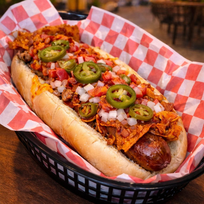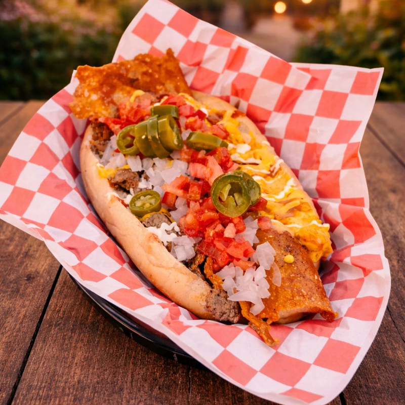 Salchicha de res kirkland de 20cm envuelta en queso monterrey,carnde de res,tocino,aderezo especial de la casa,mayonesa,ketchup,mostaza,tomste,cebolla,champiñon,pepinillo dulce