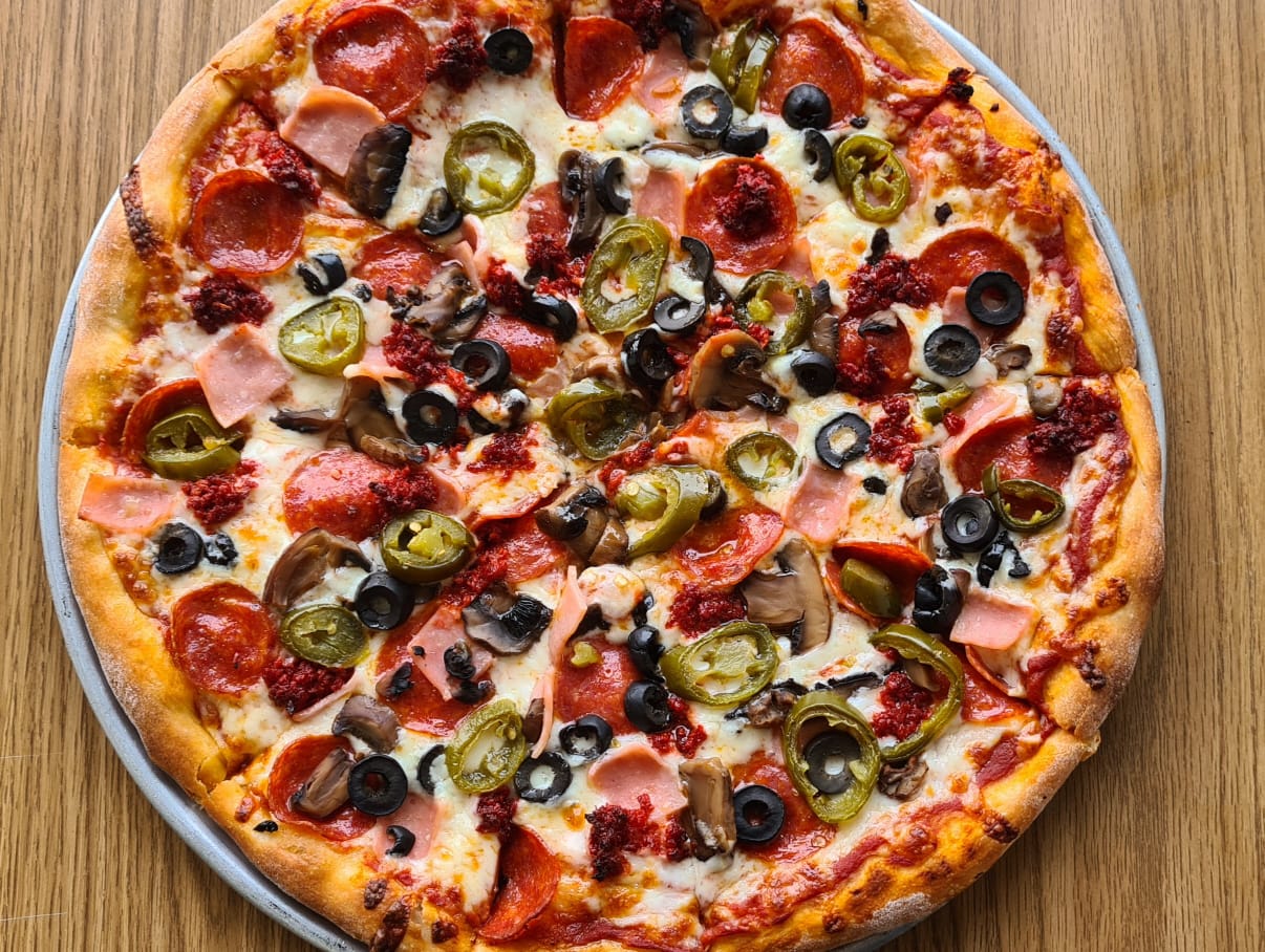 Pizza Cochi (peperoni, jamón, chorizo, champiñón, aceitunas negras y jalapeños).