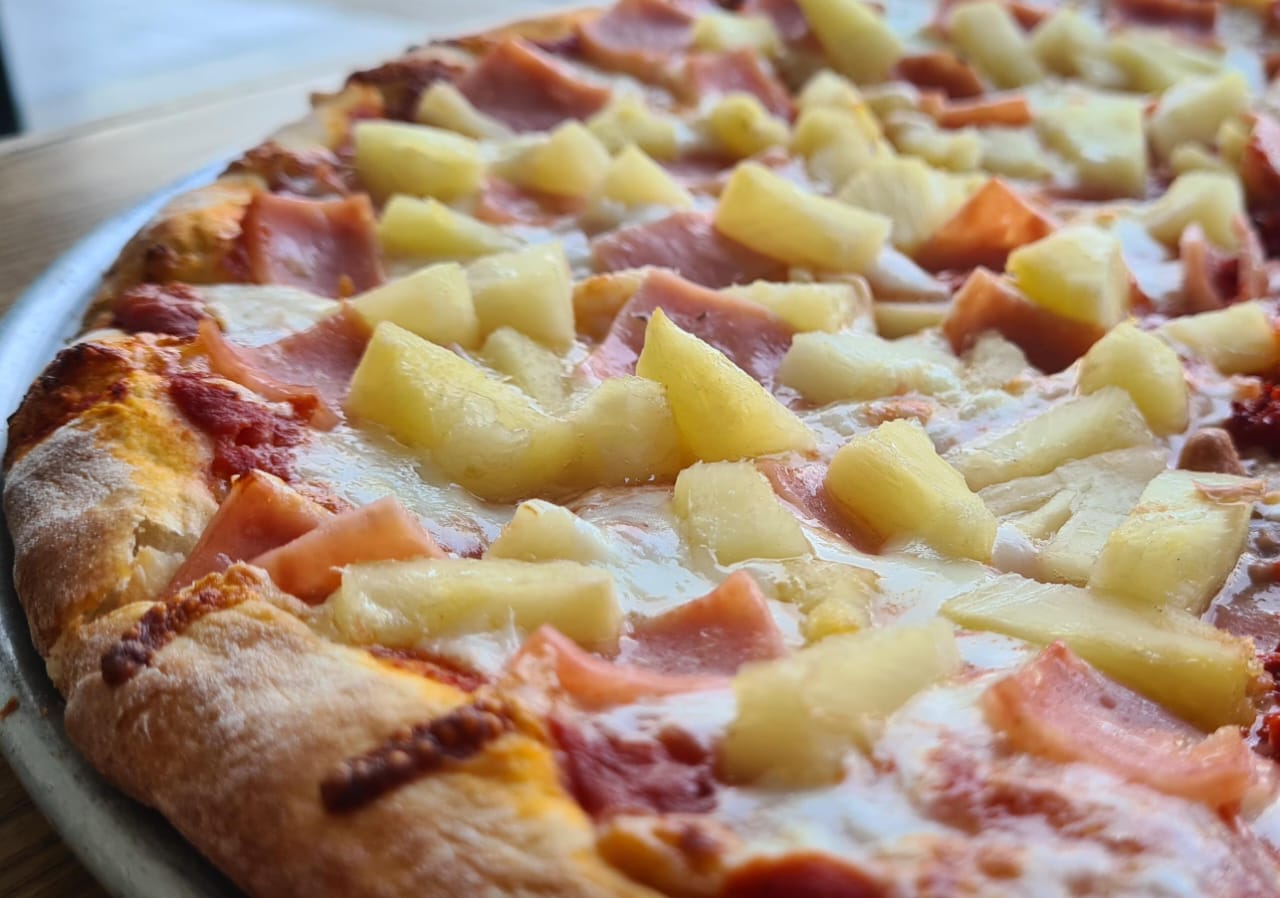Pizza hawaiana, jamón y piña (salsa pomodoro, queso mozzarella, jamón y piña).