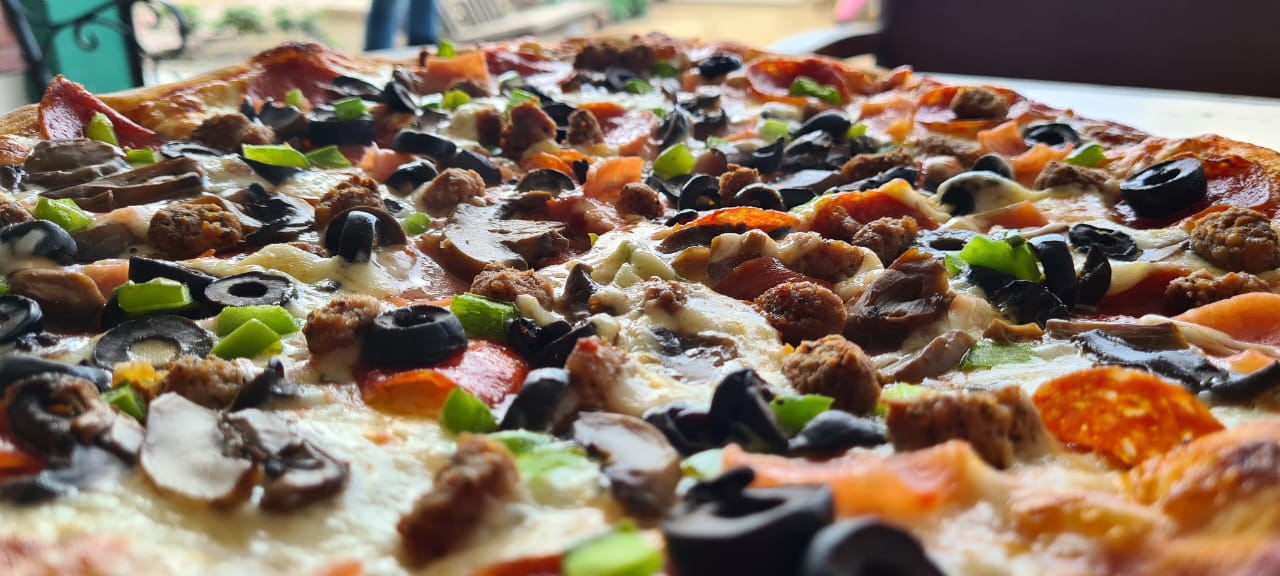 Pizza Fiesta (peperoni, jamón, salchicha italiana, champiñón, aceitunas y pimiento morrón).