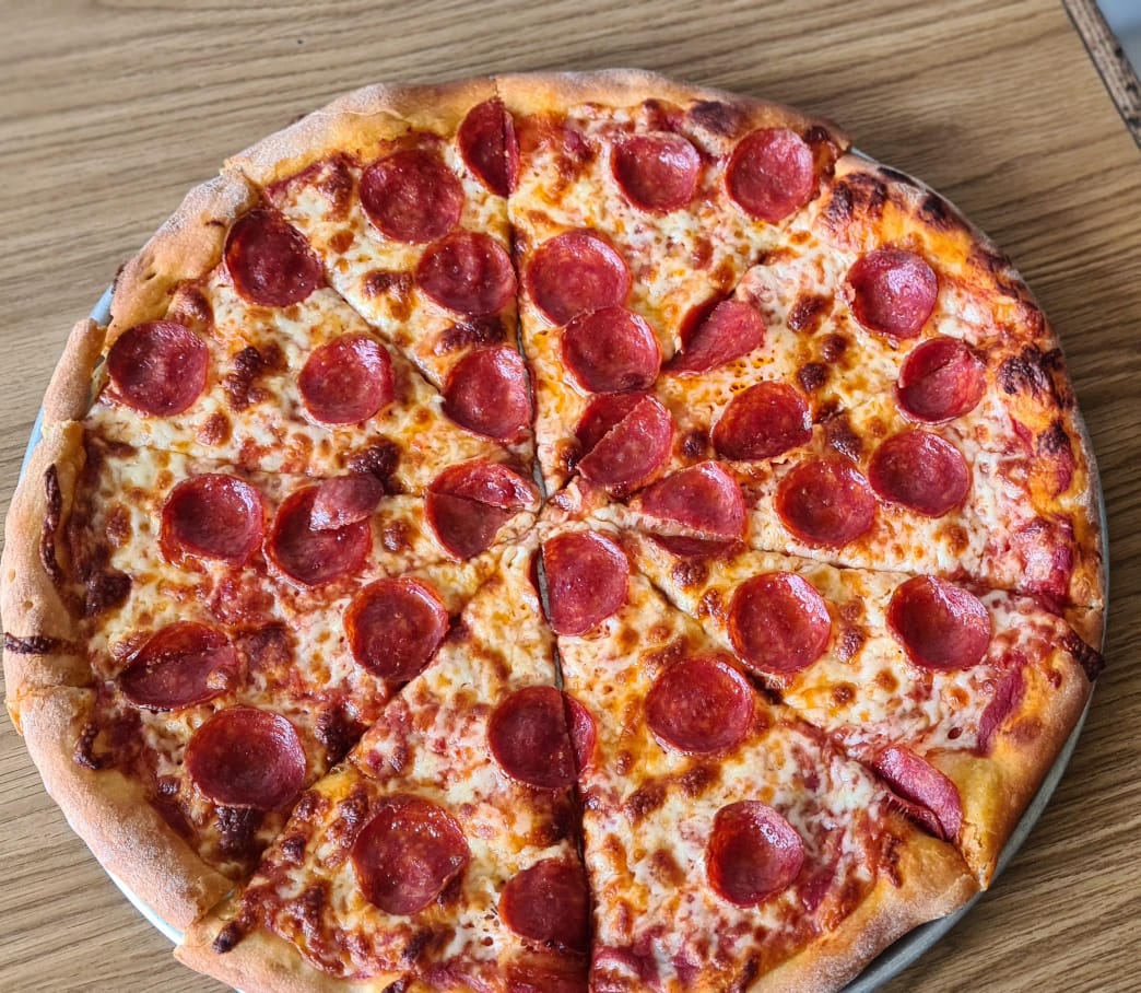 Pizza combinada (peperoni, jamón, champiñones, aceitunas y pimiento morrón).