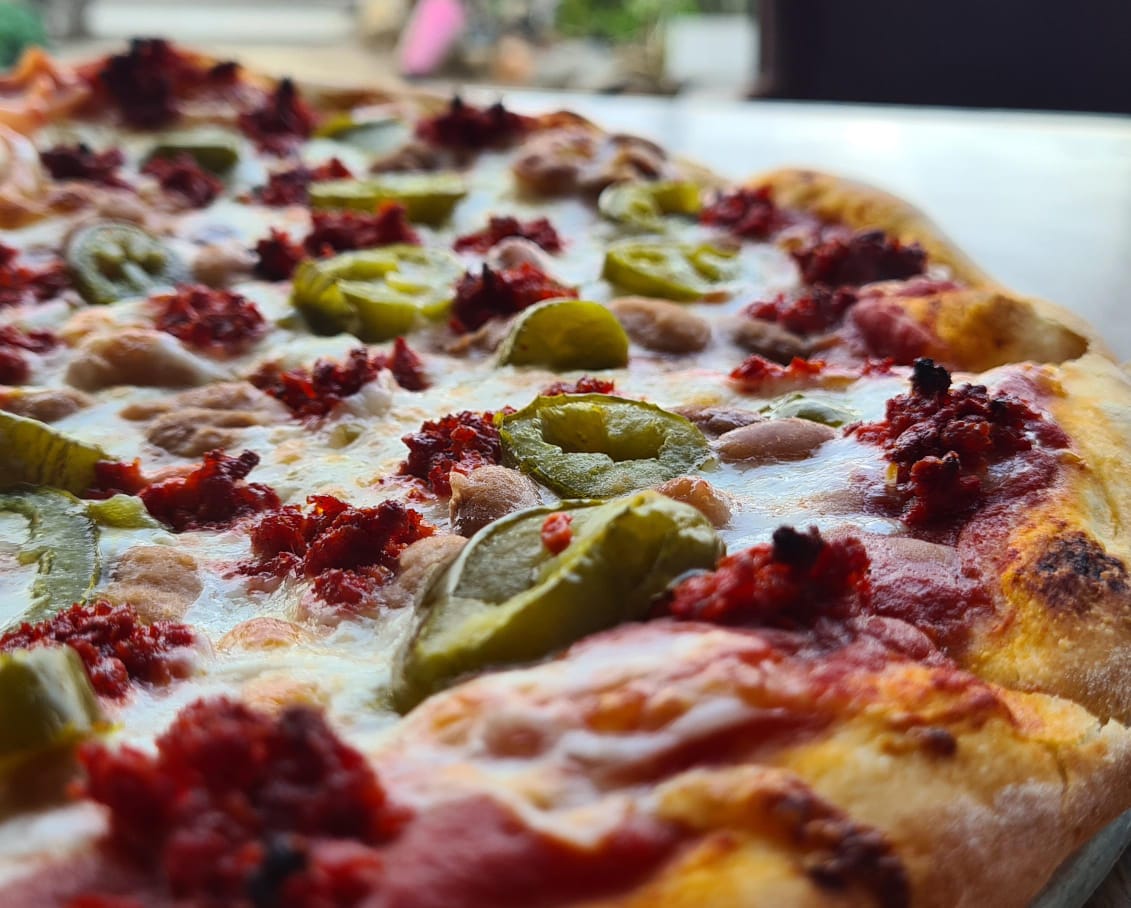 Pizza mexicana (jamón, frijol, chorizo y jalapeños).