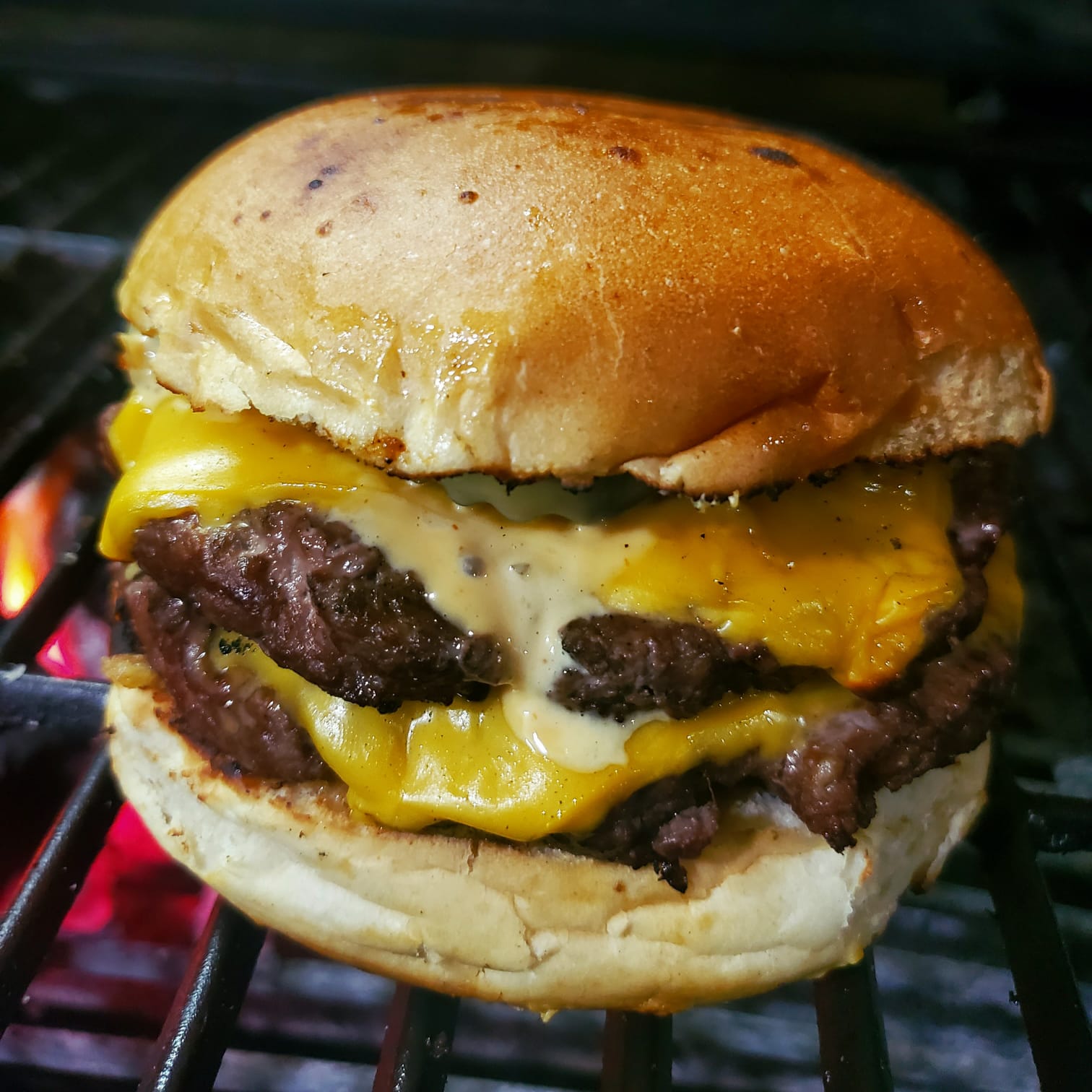 Doble molida de res a la parrilla con queso americano, pan brioche, aderezo del patrón y pepinillos. Incluye papas fritas.