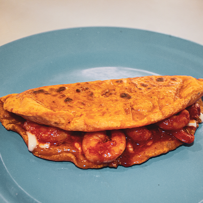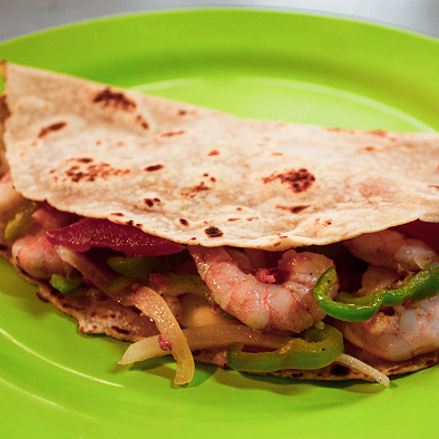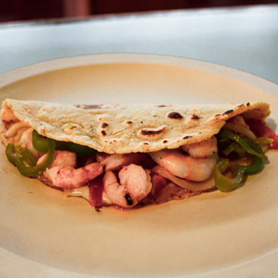 Camarones, una base de ajo, verdura y queso, tortilla de haria hecha a mano
