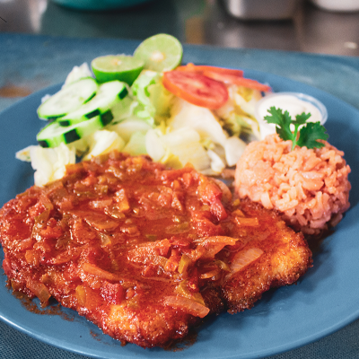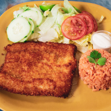 Filete de pescado empanizado con una salsa de tomate, arroz, ensalada y aderezo