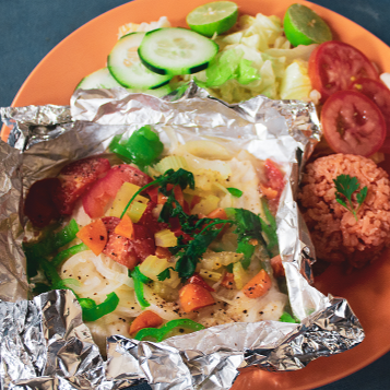 Filete de Pescado al Vapor, con verduras y vegetales, mantequilla, arroz, ensalada y aderezo