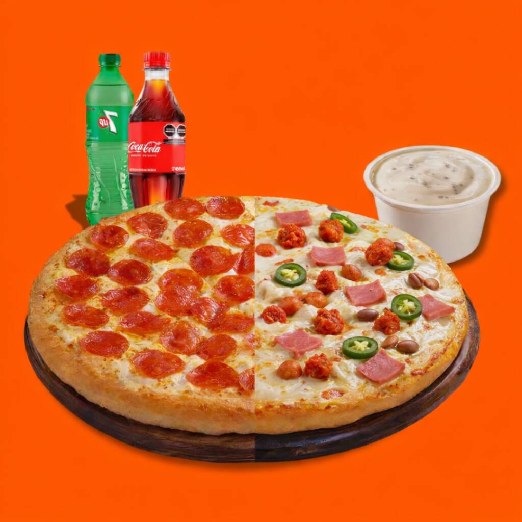 Coca cola orignal 450 ml*1 + 7 Up 400 Ml*1 + Aderezo Chipotle*1 + Grande Mitad Pepperoni Mitad Mexicana*1