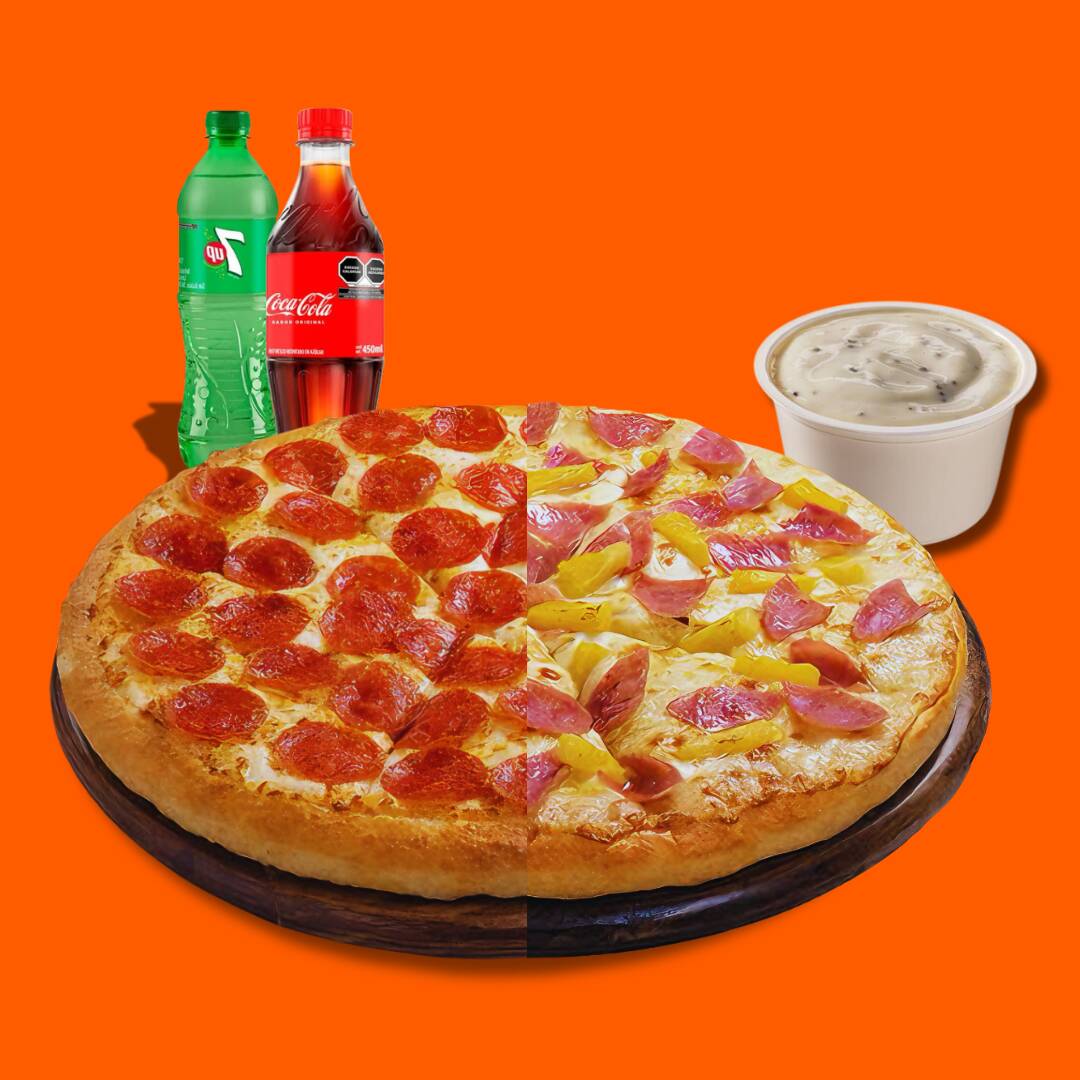Coca cola orignal 450 ml*1 + 7 Up 400 Ml*1 + Aderezo Chipotle*1 + Grande Mitad Pepperoni Mitad Hawaiana*1