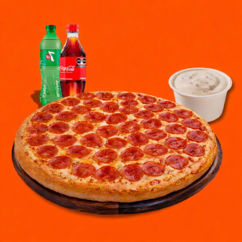 Coca cola orignal 450 ml*1 + 7 Up 400 Ml*1 + Aderezo Chipotle*1 + Pizza Grande Solo Pepperoni*1