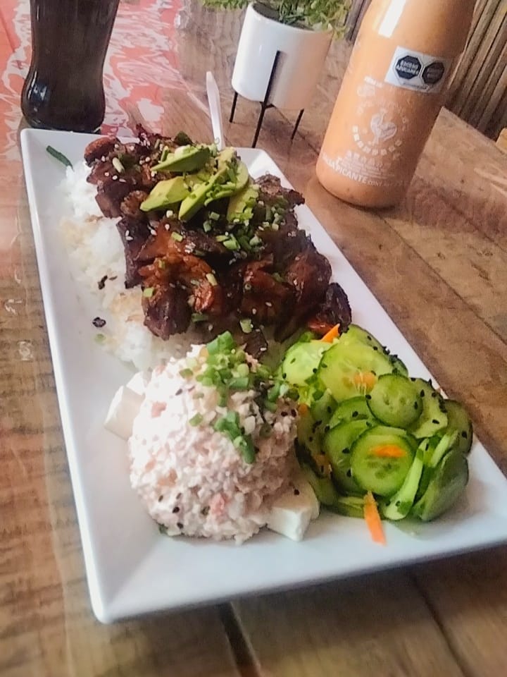 Orden Teriyaki (pollo) Xgrande gratinado con queso Monterrey, cama arroz blanco japonés, Marlin ahumado, Philadelphia, aguacate y ensalada pepino.