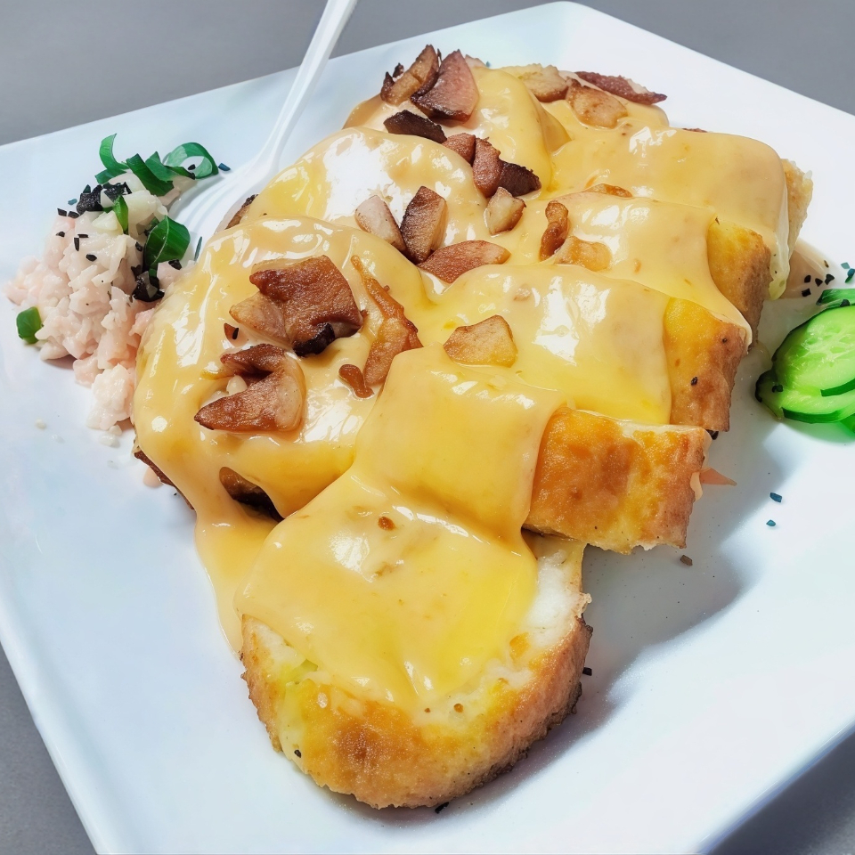 Bola de arroz rellena de Philadelphia, Teriyaki mixto (pollo y res,) tampico y aguacate. Incluye aderezo chipotle y chiles en soya.
