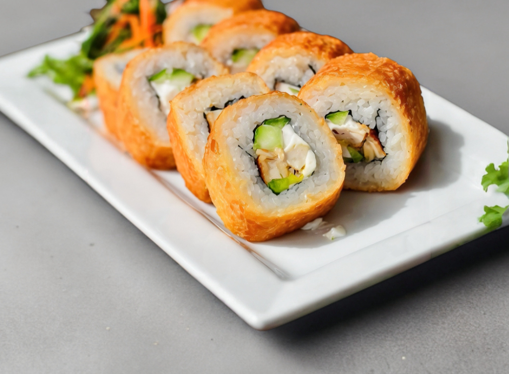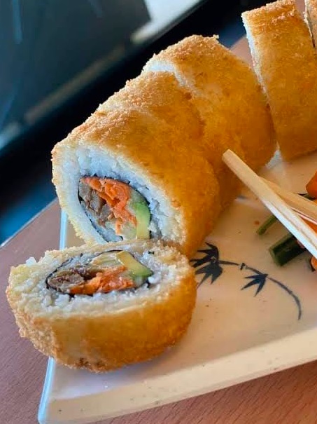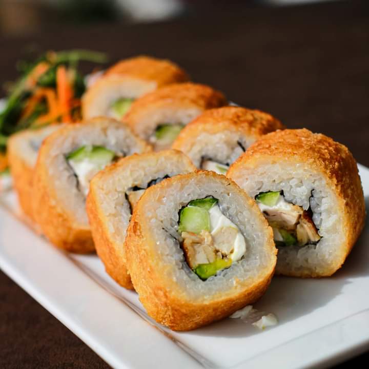 Bola arroz empanizado rellena de Philadelphia, Camarones empanizados, Marlin ahumado y aguacate.