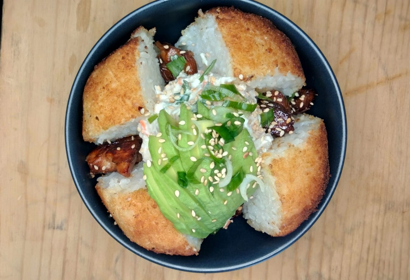 Bola de arroz rellena de Philadelphia, Pollo empanizado, Tampico y aguacate. Incluye aderezo chipotle y chiles en soya.