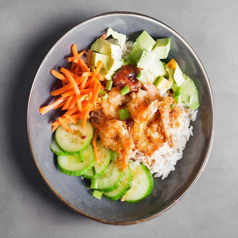 Orden personal de arroz japonés blanco, camarón empanizado, cangrejo tampico, aguacate y Philadelphia. Incluye aderezo chipotle y salsa anguila.