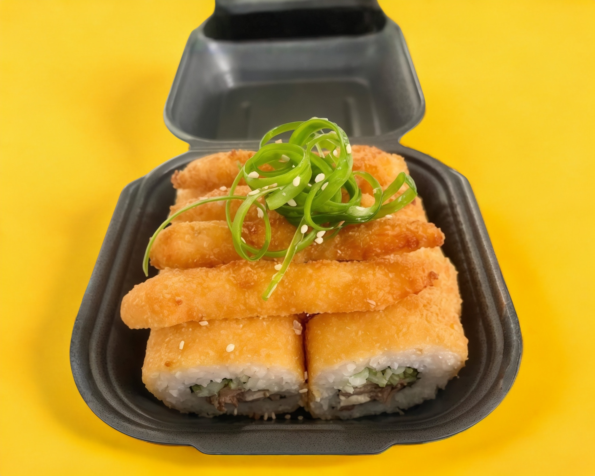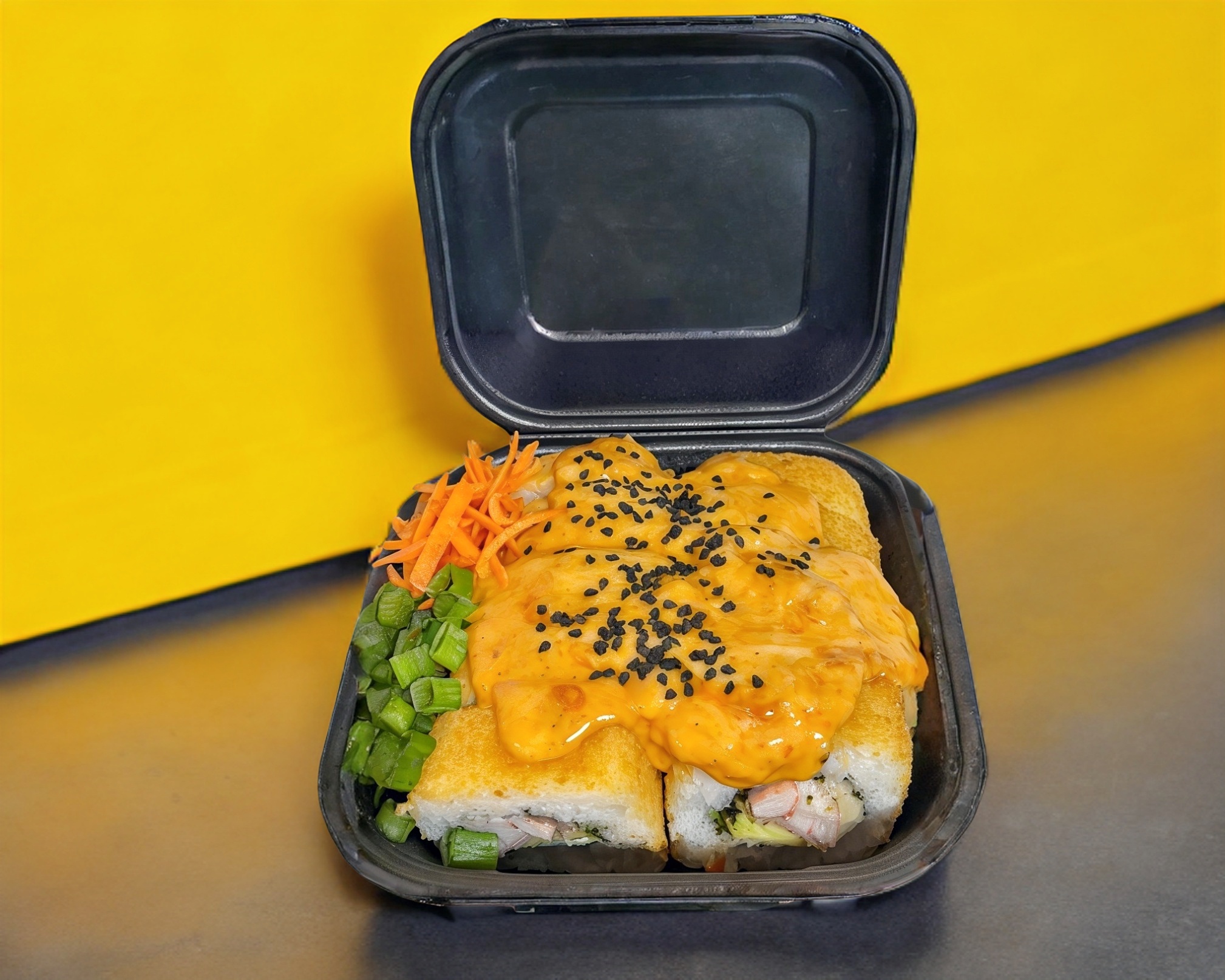 Roll relleno de aguacate, philadelphia, queso monterrey, forrado de una deliciosa capa de queso manchego