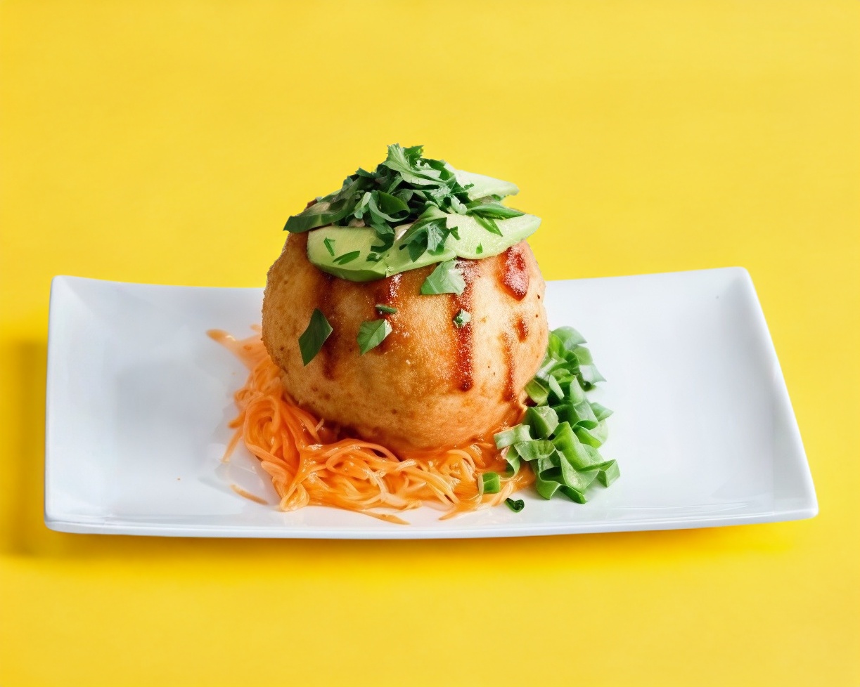 bola de Cangrejo, camarón, chile jalapeño, arroz, queso philadelphia, queso monterrey, coronada con Surimi Spicy
