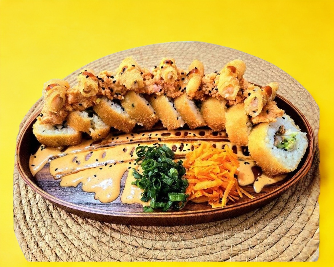 Roll relleno de Camarón, pollo, Res, aguacate philadelphia coronado con camarón Empanizado