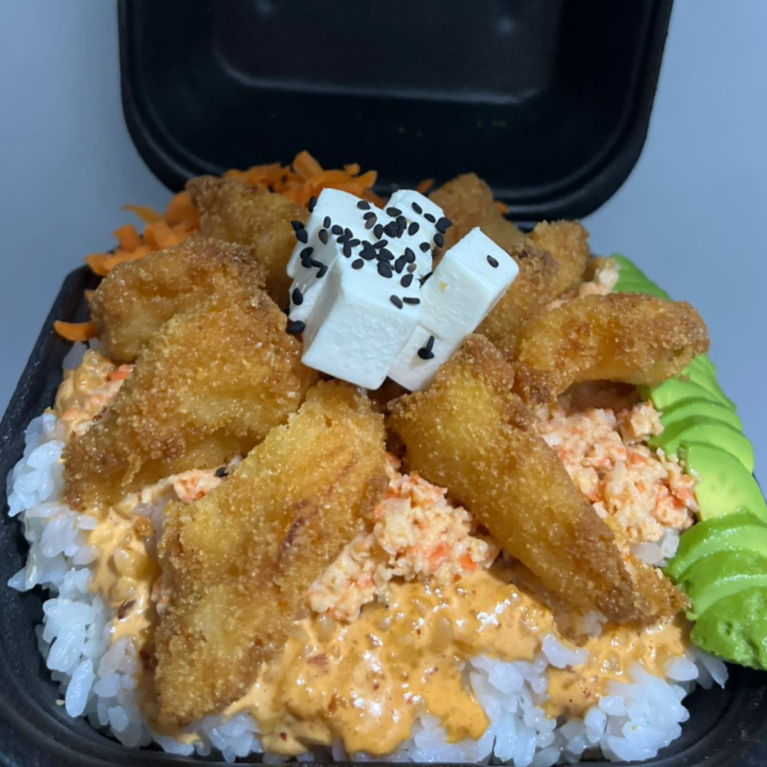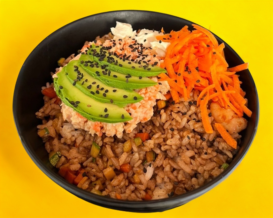 Arroz frito, verduras mixtas, camarón, aguacate, Tampico Spicy y philadelphia