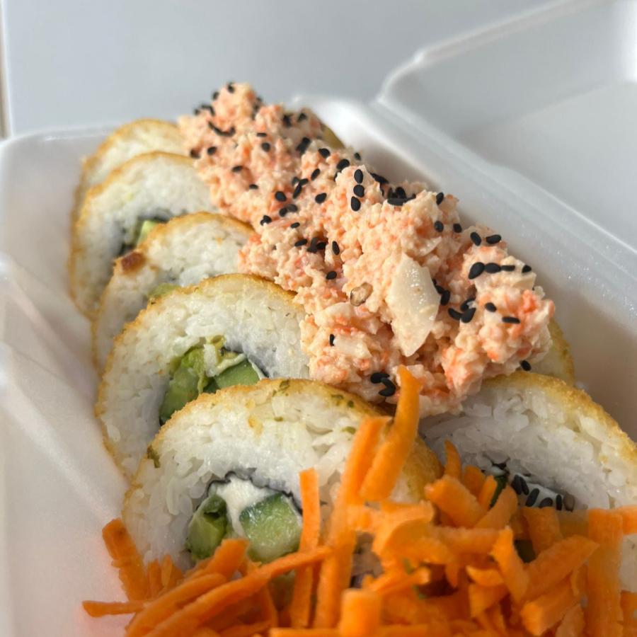 Roll relleno de pollo, aguacate, queso philadelphia coronado con Surimi Spicy y camarones empanizaods