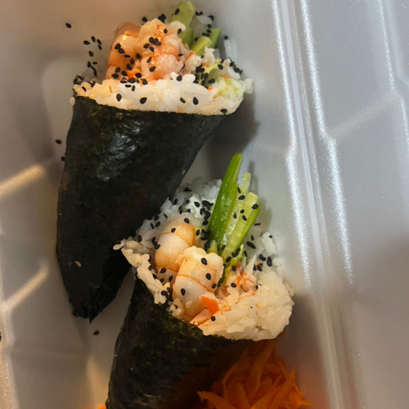 2 conos de arroz forrados de alga, rellenos de queso Philadelphia, pepino, aguacate surimi y camarón