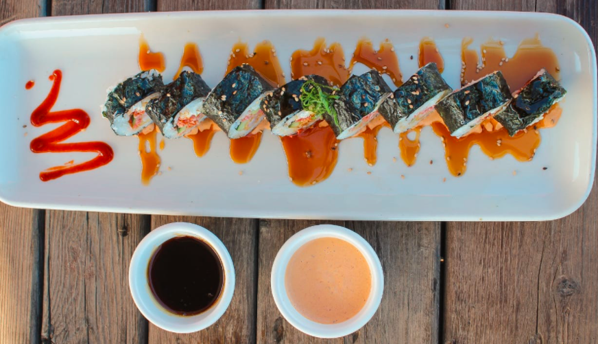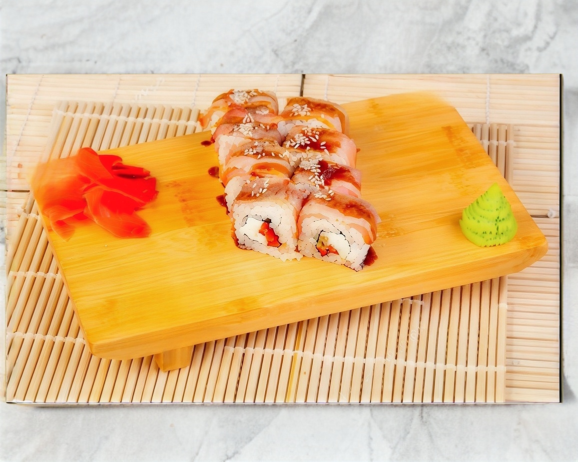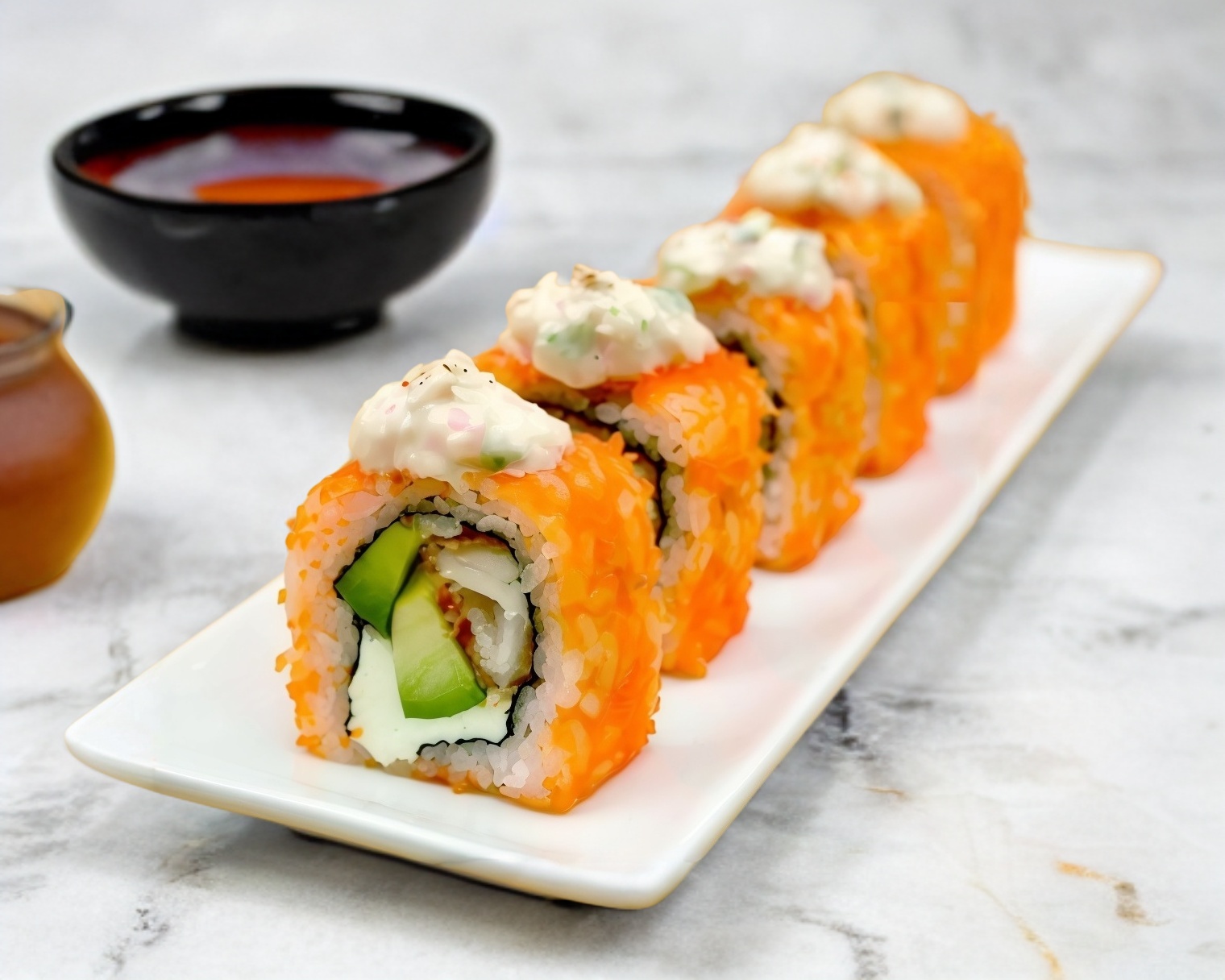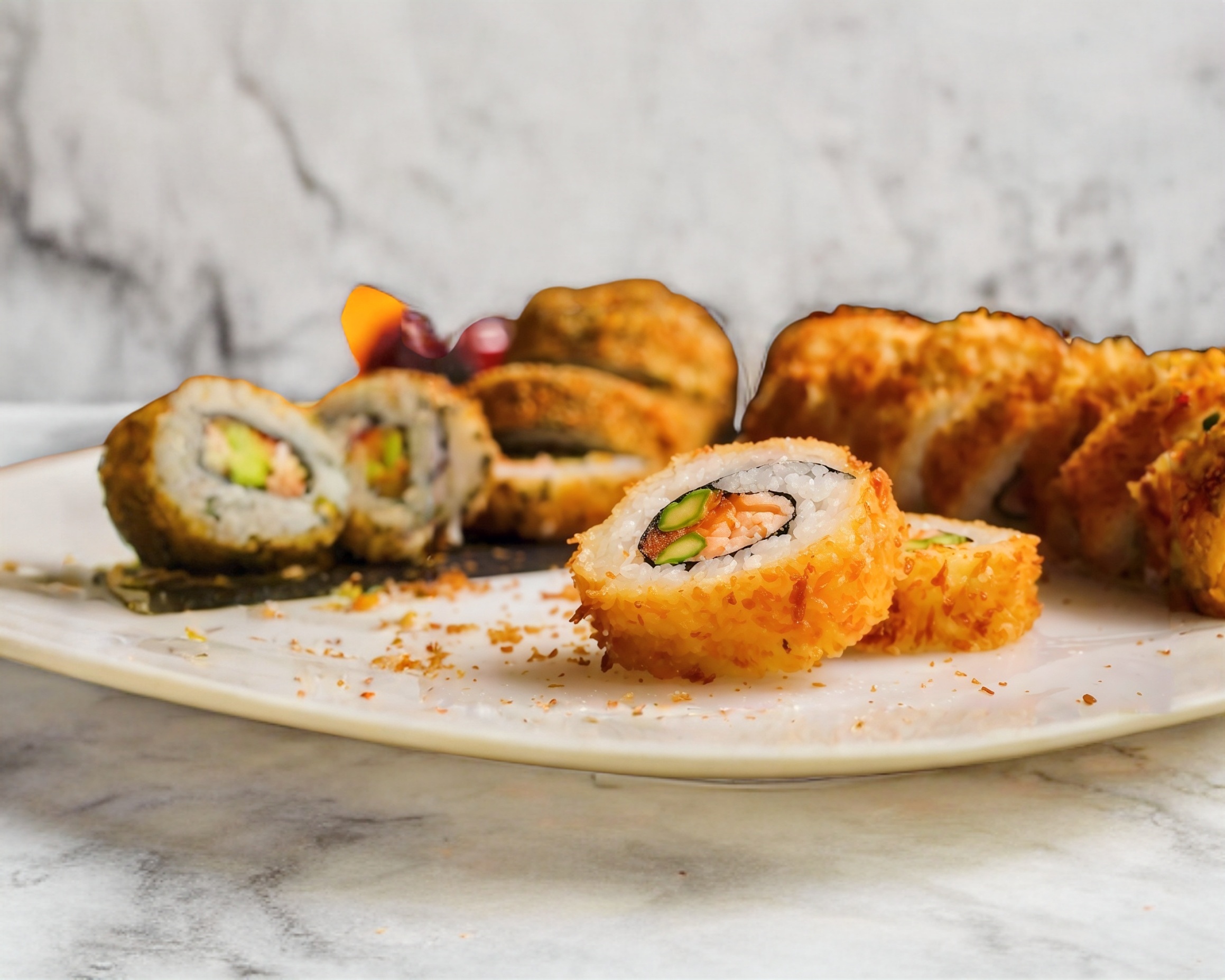 Queso crema, aguacate, camarón capeado, forrado de marlín ahumado.